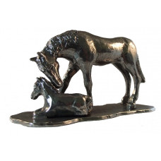 Paard met veulen gepatineerd glanzend tin: Hoogte 6cm lengte 10,5cm..