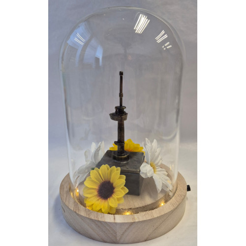 Deze glazen stolp staat op een blanco houten basis, creëert absoluut een fijne chique sfeer in uw interieur.