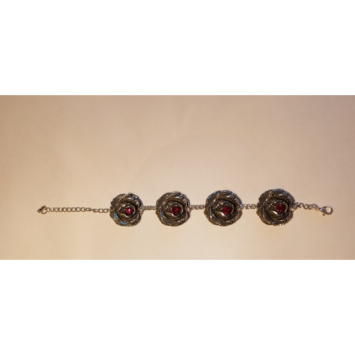 Armband gemaakt met tinnen roosjes met swarovski steentjes en met een verlengkettinkje nikkelvrij. totale lengte 20,5cm in te korte tot 15cm Gemaakt van een nikkelvrije ketting.
